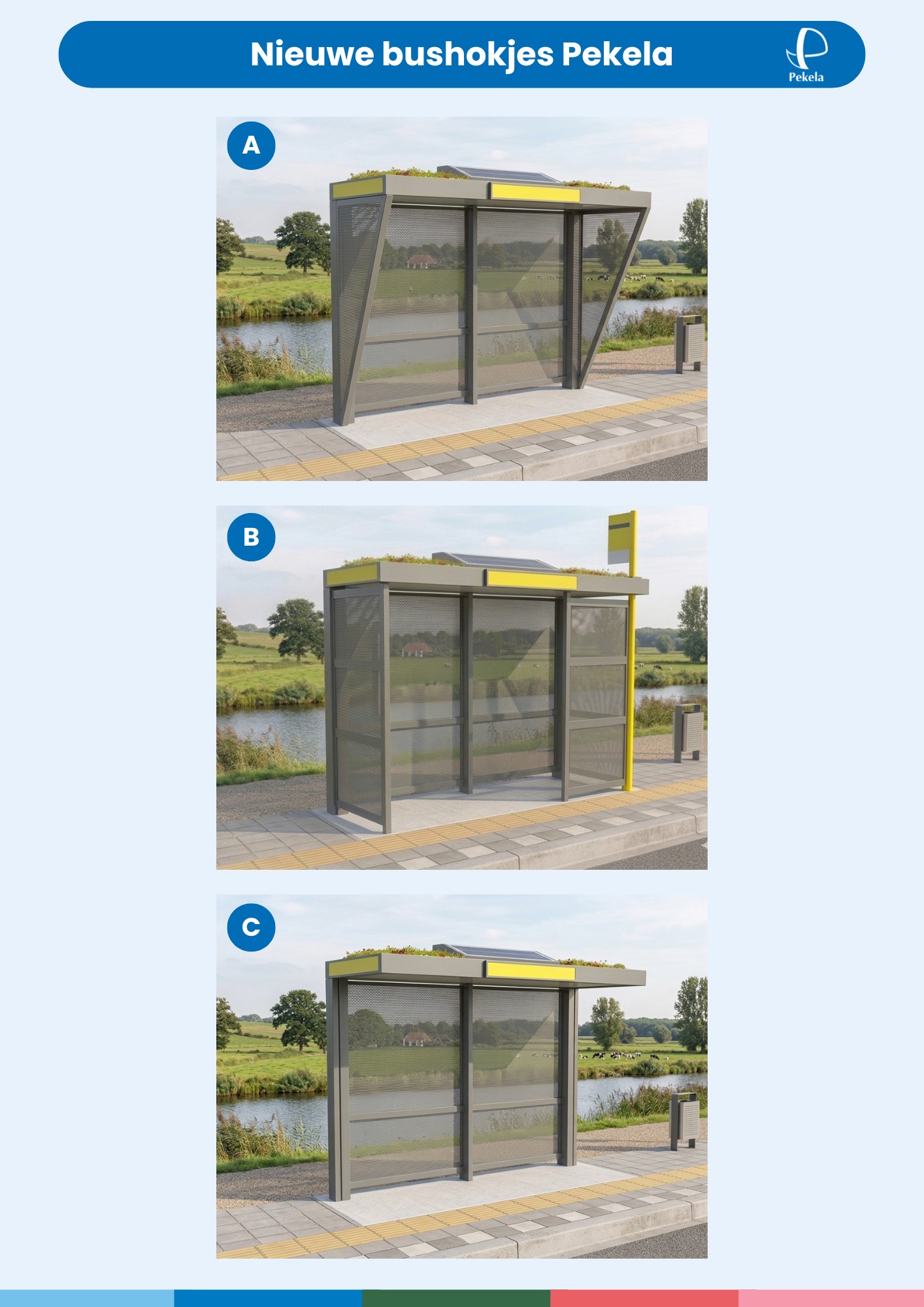 Van 9 tot en met 16 maart kunnen inwoners hun stem uitbrengen via de online enquête op www.pekela.nl/vragenlijstbushokjes. Inwoners kunnen kiezen uit drie verschillende ontwerpen. Op basis van de uitkomsten van de enquête wordt het meest populaire type gekozen.